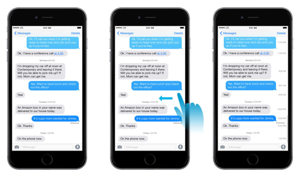 아이폰의 아이메시지를 비롯한 문자메시지는 화면을 왼쪽으로 당기는 것으로 메시지를 수신/발신한 정확한 시간을 확인할 수 있다. 아이메시지를 이용하는 분들은 꽤 적지만, 그래도 필요할 수 있으니 알아두자.