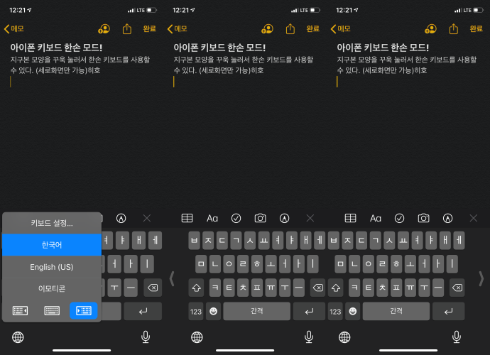 세로화면의 키보드는 지구본 버튼을 꾸욱 눌러 한손 키보드로 사용할 수 있다. 왼손, 오른손이 있으니 선택해 사용하는 것을 추천! 양손으로 타이핑 하기 어려울 때 도움이 된다.