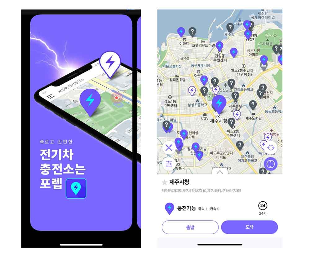구글플레이나 애플스토어에서 ‘제주전기차’ 아니면 ‘제주전기차충전소’ 만 검색해도 관련 어플을 받을 수 있다. 나는 ‘포렙 (FOREV)’ 이라는 어플을 이용했는데, 주변 전기차 충전소를 미리 찾을 수 있었고, 급속충전기가 몇대있고 일반 충전기가 몇대 있는지, 현재 몇 대가 충전중인지를 금방 알 수 있어 좋았다.