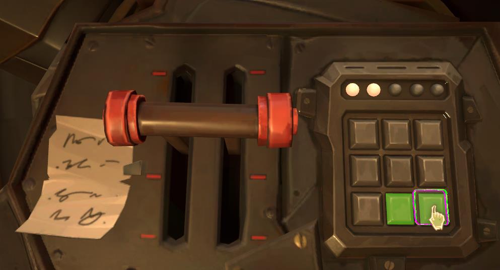 고물 기계를 찾아서 작동하시면 미니 게임이 시작됩니다. 간단한 퍼즐 방식의 게임인데요. 레버를 당겨주시면 소리가 출력되며 연두색 버튼이 하나 둘 켜지는 것을 확인하실 수 있습니다. 기억력 테스트 게임이라고 볼 수 있을 것 같은데요.