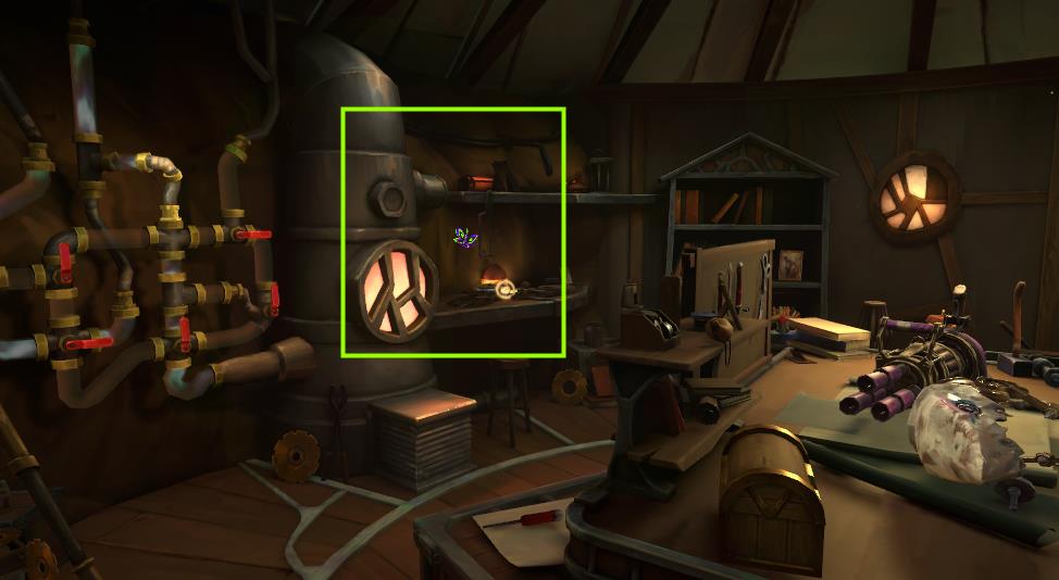 기계를 이용해 미니게임을 완료하셨다면 두 번째 부품을 찾으시면 되는데요. 위 사진처럼 징크스의 총이 있는 테이블 건너편, 파이프 기준으로 오른쪽에서 보실 수가 있습니다. 여기서는 특별히 해야 하는 것이 없기 때문에 상호작용만 해주시면 됩니다.