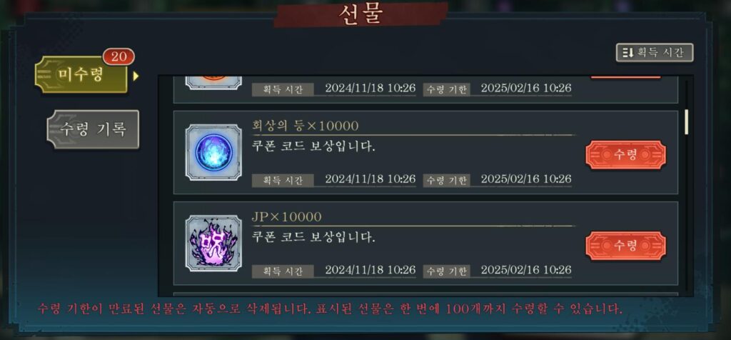 입력하는 쿠폰 코드에 따라서 보상이 다르며 받게 되는 보상은 ‘선물함’에 있습니다. 곧바로 인벤토리로 향하는 게 아니라 선물함에서 수령을 해야 계정에 적용이 되기 때문에 반드시 수령 확인을 하시기 바랍니다!
