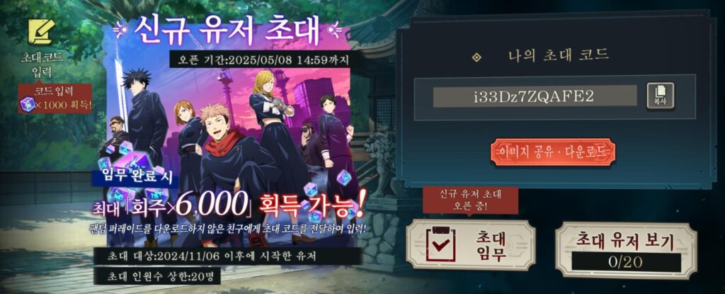 친구들과 함께 주술회전 팬텀 퍼레이드 쿠폰 코드를 사용하면 회주를 얻으실 수도 있습니다. 같이 할 친구가 없다면 국내 커뮤니티 또는 해외 주술회전 커뮤니티를 이용하여 코드를 맞교환 하시면 됩니다.