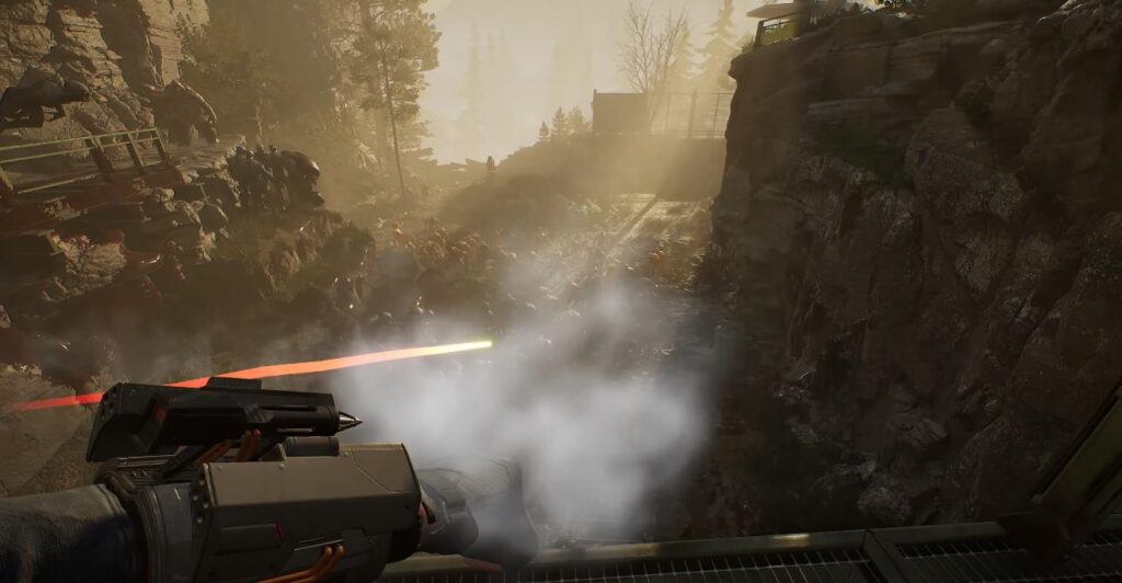 킬링플로어 3도 이러한 시선을 피하긴 어려워 보였습니다. 진보적인 기술, 예를 들어서 위 사진처럼 암런쳐를 통해 미사일을 발사하는 것과 같은 장면들은 오히려 흥을 깨는 것이라는 이야기를 듣게 되었는데요. 하지만 이미 게임의 컨셉은 확고한 것 같습니다.