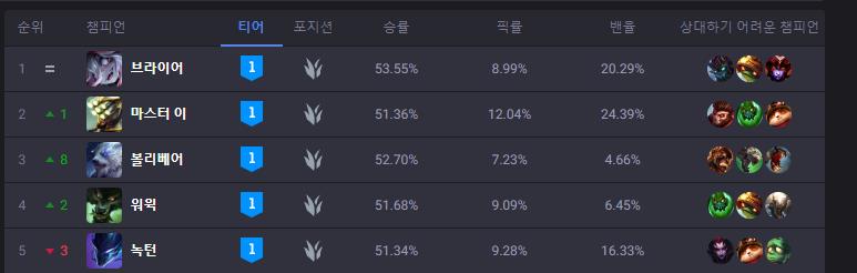 브론즈 티어에서는 브라이어 – 마스터 이 – 볼리베어 – 워윅 – 녹턴 순으로 나타나고 있습니다. 사실, 볼리베어도 OP에 해당했지만 저티어일수록 고평가 되고 있는 챔피언을 자주 픽하는 경향이 조금 적게 나타나는 경향이 있습니다. 그래서 볼리베어가 이처럼 저조한 픽률과 밴율을 보이는 것 같은데요.