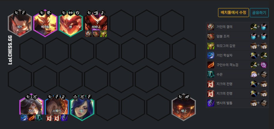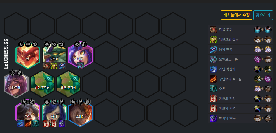 롤토체스 시즌7의 챔피언 및 아이템 이미지이다.