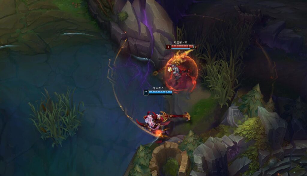 하지만 쓰임새는 사용자에 따라, 상황에 따라서 매우 많이 바뀔 수 있습니다. 예를 들어, 아군 원딜이 적 탱커에게 마크되어서 쫓기고 있는 상황이라면 자르반은 깃창 + 궁을 통해서 적 탱커를 고립시킬 수 있습니다.