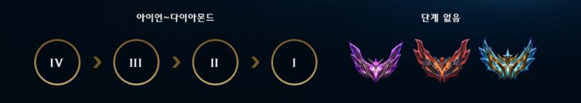 • 아이언 – 브론즈 – 실버 – 골드 – 플레티넘 – 에메랄드 – 다이아몬드 – 마스터 – 그랜드마스터 – 챌린저