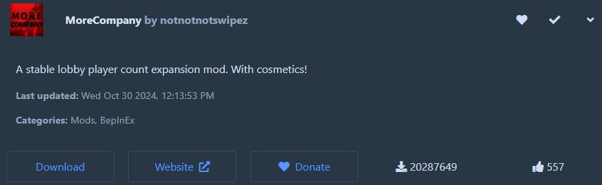 첫 번째로 소개할 모드는 기본 중 기본! MoreCompany입니다. 원래 리썰 컴퍼니는 상당히 제한적인 유저수(4명)로 플레이 해야 한다는 단점이 있었습니다. 하지만 이 모드를 적용할 경우 최대 플레이어가 8명으로 확장되기 때문에 재미는 물론, 편의적인 측면에서도 이점을 누려볼 수가 있습니다. 때문에 리썰 컴퍼니가 4인게임이라고 알고 계셨던 분들은 이 모드를 이용하면 무리없이 플레이가 가능하니 주저하지 마세요!