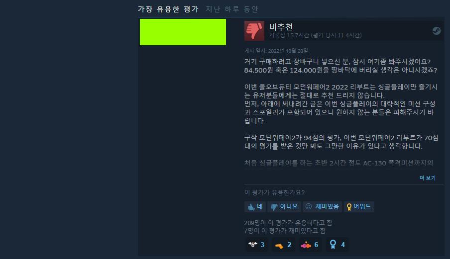 그렇다면 ‘영향력’ 있는 순으로 하여 유저들의 실 후기를 통해서 모던워페어 2 가 어떠한지에 대해서도 알아보려고 하는데요. 위 글은 가장 ‘영향력’ 있는 댓글로 뽑힌 것입니다. 제가 생각했을 때에도 게임에 대해서 잘 정리한 글이라고 생각되어 가져왔습니다. 글이 길기 때문에 굉장히 초압축적으로 표현하자면 ‘싱글플레이 할 사람은 사지 말고, 멀티플레이까지 즐길 사람만 사세요’ 라는 글인데요.
