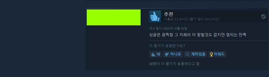 후기에 대해서는 부정적인 것 2가지, 긍정적인 것 2가지로 가져왔습니다. 모두 ‘유용함’ 순에서 차순위에 있는 내용들이고 위 사진 두 가지 같은 경우는 긍정적인 리뷰에 해당합니다. 하지만 ‘추천’ 함에도 불구하고 이들의 리뷰 내용에는 싱글플레이에 대한 비판적인 견해 역시 들어가 있는데요.