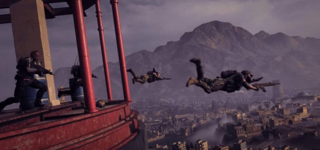트레일러의 한 장면을 가져와 보았는데요. 대원들이 고층 건물에서 낙하하는 장면입니다. 콜 오브 듀티와 배틀필드 모두 높은 곳에서 낙하할 때에 낙하산을 사용할 수가 있는데요. 특히 콜 오브 듀티 같은 경우 워존을 거치면서 낙하산이 더욱 더 자유롭고 민첩한 기동이 가능하다는 것이 특징이었습니다.