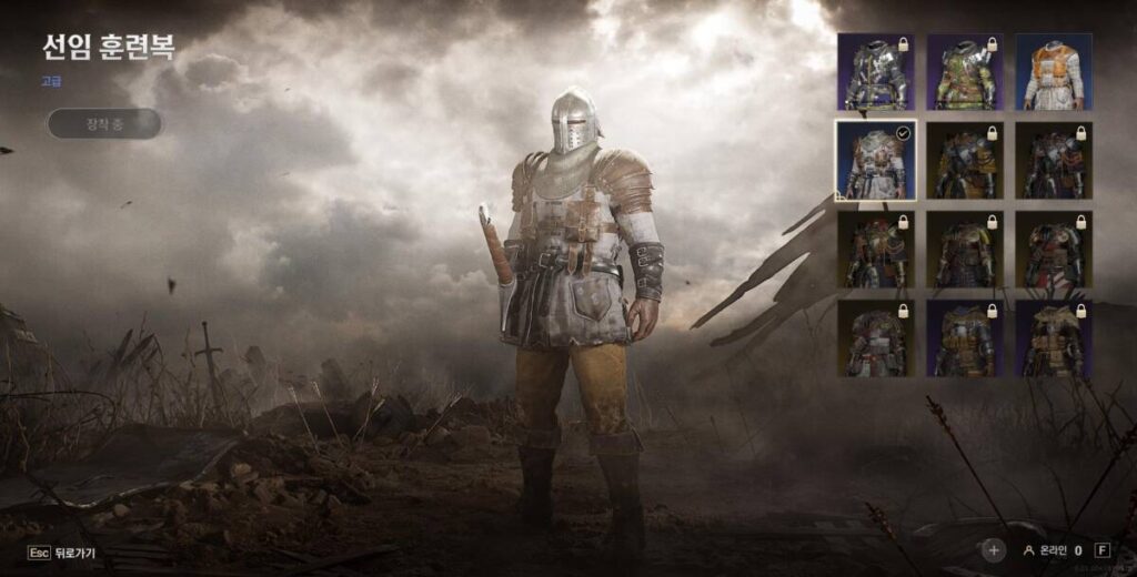 위 사진은 등장 캐릭터 중 하나인 ‘블레이드’ 에게 선임 훈련복을 장착시킨 모습인데요. 바로 이전에 살펴본 모습에 비하면 다소 무언가 갖추어져 있음을 느끼실 수 있을 것입니다. 기본 토대는 같은 것이긴 하지만, 여러 가지 디테일이 더해지니까 조금 더 중세 검사의 느낌이 강해졌습니다. 이것만 장착하더라도 다른 유저들과는 조금 다른 외형을 누릴 수가 있습니다.