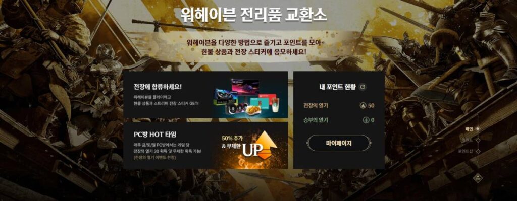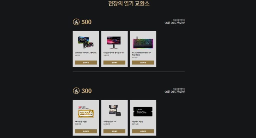 현재 이 게임에서는 다양한 이벤트를 진행하고 있습니다. 단순히 게임을 플레이 하면서 게임 아이템을 얻을 수 있는 것은 물론이고, 더 나아가 현물 상품을 받을 수 있는 기회도 제공하고 있죠. 다양한 이벤트 중 알아볼 것은 바로 위 사진의 전리품 교환소인데요. 일정 시간 혹은 매치를 플레이 하면 포인트가 쌓이고, 그것을 통해 현물 상품으로 변경할 수 있는 이벤트입니다. 하지만 게임에 어느 정도 시간 투자가 가능한 분들이 유리한 이벤트이므로 이 점 유의 바랍니다.