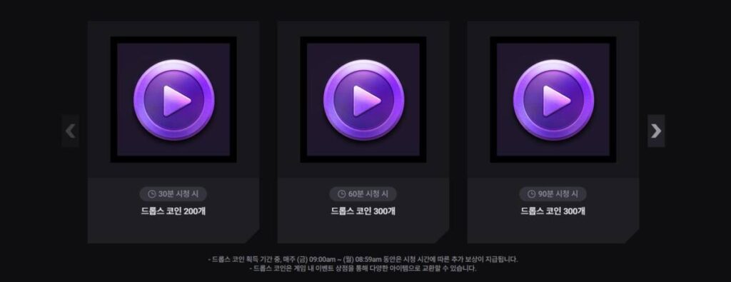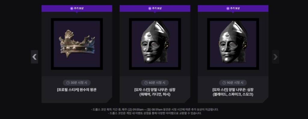 드롭스를 통해서는 위처럼 정해진 아이템들을 수령하실 수가 있습니다. 드롭스 코인 같은 경우 이벤트 상점을 통해서 인게임 아이템들을 구매할 수가 있는데요. 이외에도 시청한 시간에 따라서 스킨을 얻을 수가 있습니다.