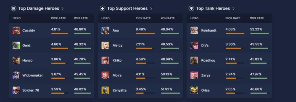 앞서 언급하였듯, 오버버프에서는 딜량, 힐량, 픽률 등 매우 다양한 정보들을 통계적으로 산출해줍니다. 그렇기 때문에 어렵게 모든 영웅을 선택하여 플레이 할 필요 없이, 승률이 높은 한 가지 영웅만 파고들면 되죠.