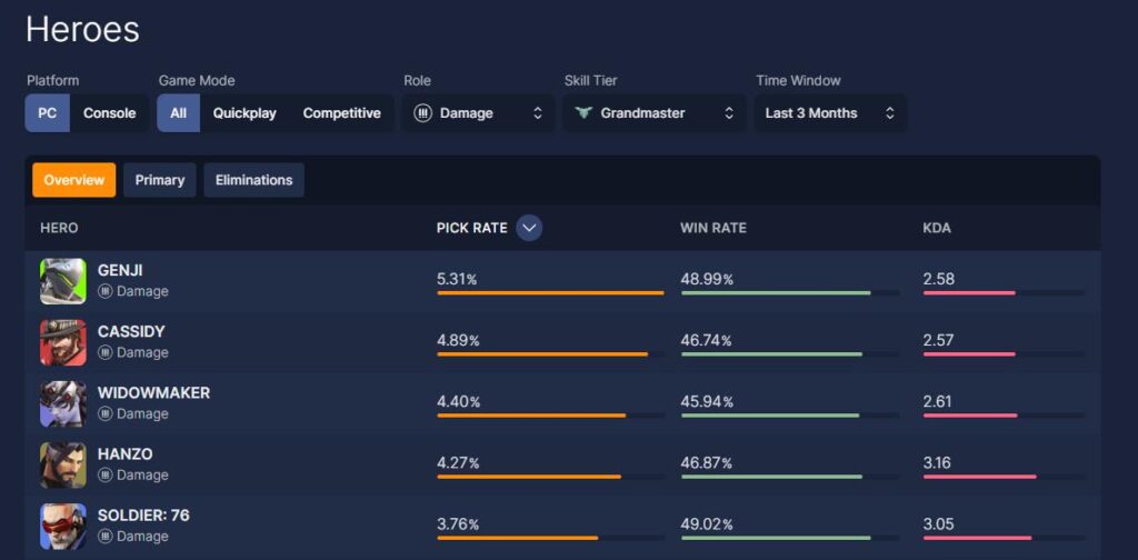 당연한 이야기겠지만, 티어별로 영웅별 승률과 픽률에 차이가 있습니다. 그랜드 마스터를 기준으로 하였을 때는 탑 1이 겐지이지만 아래, ‘전체’ 를 기준으로 하여서 리스트를 갱신할 때에는 ‘캐서디(구 맥크리)’가 1위인 것을 확인할 수 있습니다.