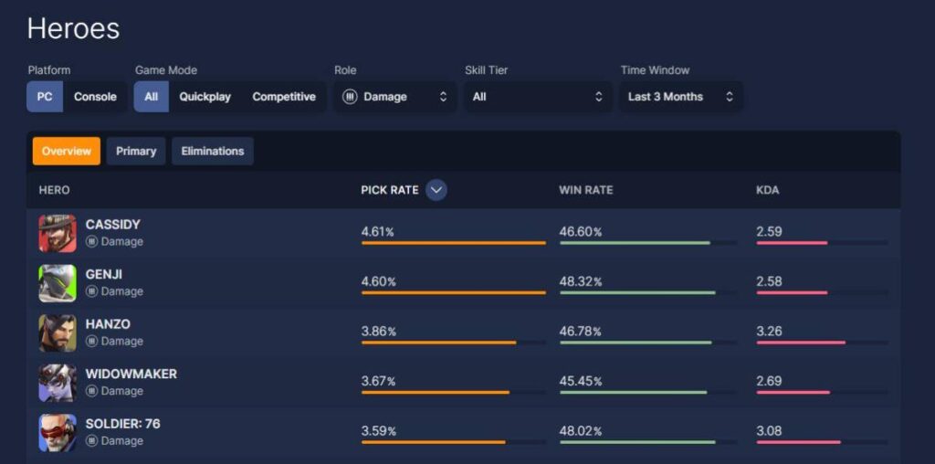 게임 모드를 경쟁전, 역할군을 자신의 역할군, 스킬 티어를 본인의 것 혹은 전체로 설정한 뒤에 승률과 픽률을 비교해보면서 어떤 영웅이 Top 3에 들어갈 수 있는지를 살펴보도록 합니다. 이 때 반드시 두 가지 요소가 평균값을 넘어서야 합니다. 그러면 위처럼 현재 오버워치 메타를 살펴볼 수 있습니다. 2023년 오버워치 2 경쟁전 공격 역할군의 메타는 캐서디, 겐지, 한조, 위도우메이커, 솔져라고 볼 수 있겠죠?