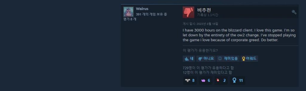현 상황과 관련하여 코어층에서도 이야기가 많습니다. 위 사진을 보면 배틀넷 시절부터 꾸준히 즐겨온 유저인데요. 이 유저 같은 경우 3000시간 이상을 플레이 했지만 더는 하지 않는다고 말하고 있습니다. 이러한 반응은 한국에서도 커뮤니티 등을 통해서 쉽게 찾아볼 수 있습니다.