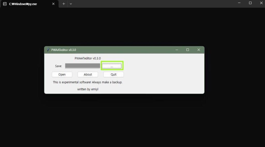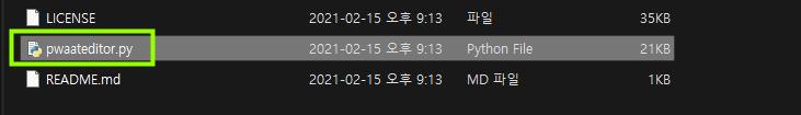 이제는 정말 다 끝났습니다! 정말 별거 없는데요. 서두에서 받아두었던 에디터파일 ‘pwaateditor.py’ 파일을 실행해주도록 합니다. (*파이썬을 다운받지 않으셨다면 정상적으로 실행되지 않습니다.)