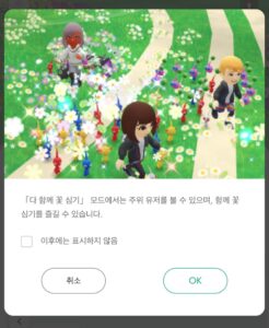 꽃을 심을 때 ‘다함께 꽃심기’ 모드를 선택하면 연결된 사용자들이 같은 지역에 심은 꽃과 유저 캐릭터가 보여집니다. 친구와 실제로도, 피크민 상에서도 함께 있는 듯한 느낌을 주는 귀여운 기능이죠.