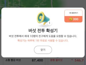 평일 기준 1회, 주말 기준 3회 확성기 기능을 통해 버섯 전투에 친구를 초대할 수 있습니다. 한 번에 10명까지 초대가 가능하며, 전투 시 처음 보는 상대의 아이콘을 탭하여 친구 요청도 보낼 수 있어요.