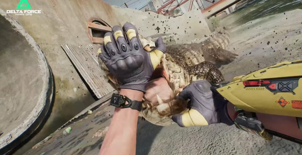 최근에 공개되고 있는 델타포스 호크옵스의 트레일러에는 흥미로운 부분들이 아주 많았습니다. 위 사진처럼 캠페인 임무를 진행하던 도중 악어를 만나서 대처하는 것을 볼 수도 있는데요. 중요한 점은, ‘멀티플레이 캠페인’에서 이러한 상호작용을 경험할 수 있다는 것입니다.
