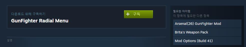 여러번 이야기 하는 부분이지만, 모드를 다운로드할 때에는 부가 모드도 당연히 살펴봐야 합니다. 앞서 언급하였듯 아르세날 건파이터 모드와 브리타 모드의 편의성을 높여주는 것이기 때문에 당연하게도 두 모두 다 활성화 되어 있어야 합니다. 그리고 아르세날 건파이터 모드 같은 경우 모드 옵션 툴을 사용하기 때문에 해당 모드 또한 정상적으로 활성화 되어 있어야 Radial Menu 를 사용할 수 있습니다.