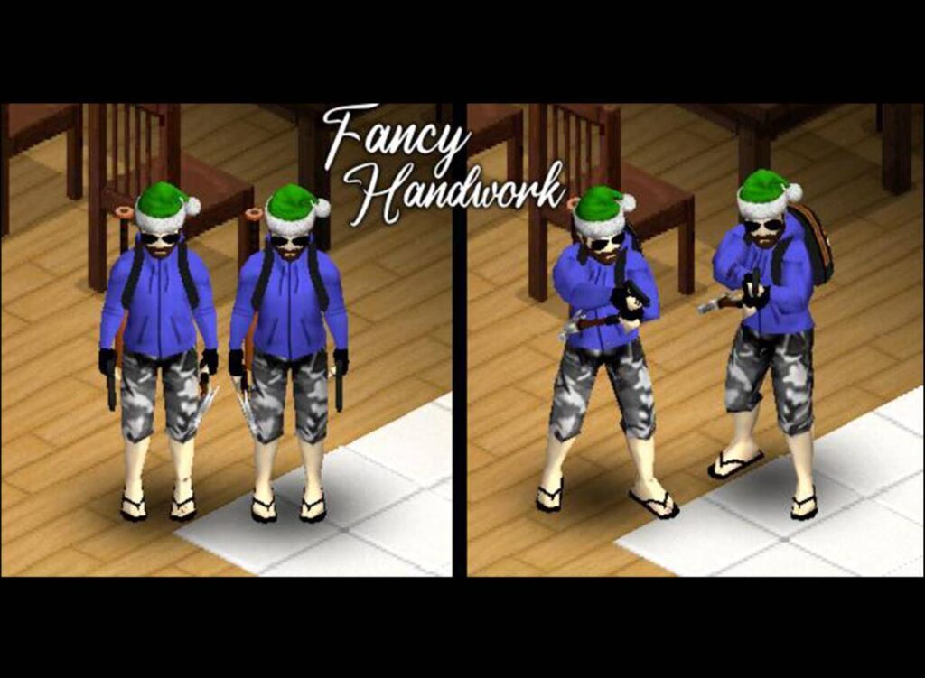 팬시 핸드워크 모드 또한 브루탈 핸드워크처럼 상당히 많은 애니메이션과 기능을 갖고 있는데요. 왼쪽/오른쪽 춤에 있는 것을 무작위 손으로 뽑아서 사용한다거나, 양손에 들고 있는 아이템을 좌/우로 바꾸는 스왑이 가능하다거나, 문이나 창문과 같은 상호작용시에 왼손/오른손이 무작위로 나타난다거나 하는 등 말이죠.