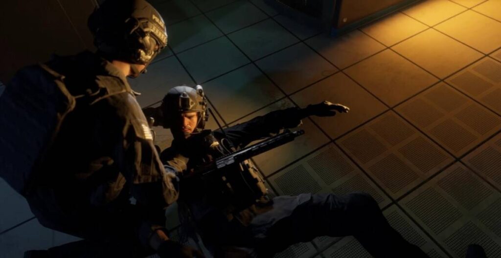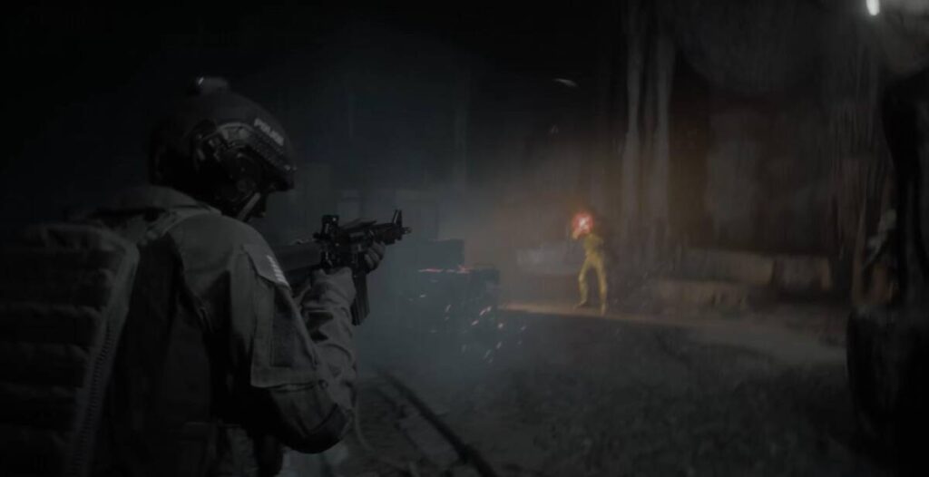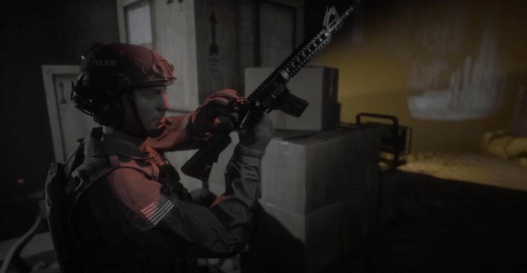 지금부터는 공식 트레일러를 살펴보도록 할게요. 레디 오어 낫에 접속하면, 피해자들과 순직한 경찰관들 등을 추모하는 공간이 있습니다. 트레일러는 이 공간에서 추모하고 있는 어느 경찰특공대원의 뒷모습으로 시작합니다. 신고자들의 목소리, 죽어가는 피해자의 목소리 등을 생각하는 이의 모습을 볼 수 있어요.