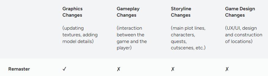 먼저 리마스터에 대해서 알아보도록 하겠습니다. ~게임이 리마스터 되었다더라 하는 소식, 한 번쯤 들어보셨죠? 위 도표를 보시면 이해하시기가 편할 것 같은데요. 리마스터는 게임에서 그래픽의 전반적인 개선을 중점적으로 이야기 하고 있습니다. 과거에 출시되었던 게임을 오늘날의 그래픽으로 다시 해석한 경우라고 볼 수 있죠. 이 때문에 그 외의 주요한 부분들은 거의 건드리지 않는다는 점이 특징이라고 할 수 있겠습니다.