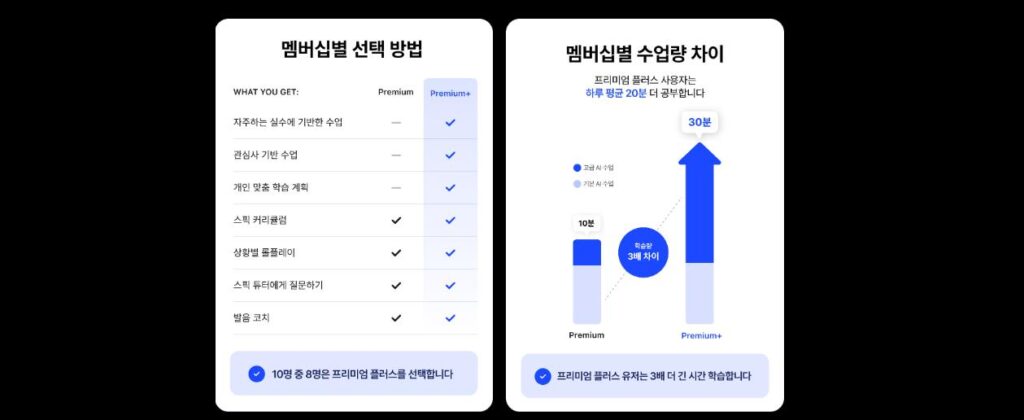 다만, 프리미엄 플러스에서는 좀 더 개인에게 맞춰진 커리큘럼과 교정을 받을 기회를 주는데요. 실시간 피드백은 물론, 개인에게 맞춰진 커리큘럼과 발음 교정 등 보다 면밀하고 정교한 수업이 가능해집니다. 때문에 ‘가볍게’ 공부를 시작하는 느낌으로 접근하실 분들은 프리미엄, ‘진짜’ 제대로 해보고 싶은 분들은 플러스 추천드립니다.