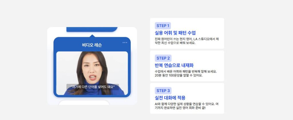 앞서 이야기 드린 것과 같이, 당장 사용 가능한 실용성을 지녔을 뿐만 아니라 한국인이 약한 부분인 말하기와 듣기에 집중하고 있다는 점, 프리미엄 플러스 같은 경우 개인에게 집중된 교육이 가능하다는 점이 그 이유죠.