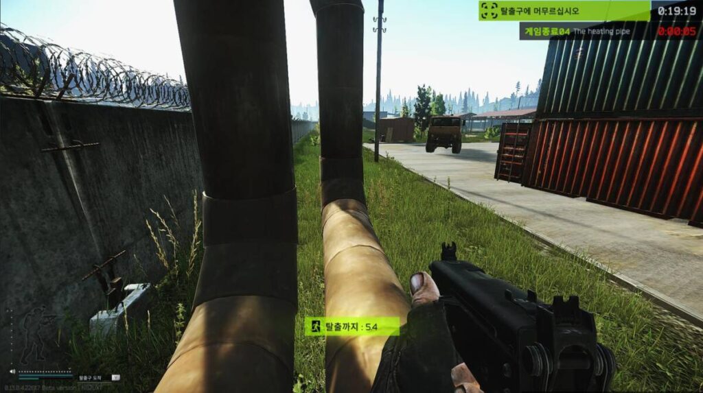 K창고까지 야무지게 루팅을 했다면 그대로 제일 가까운 탈출구인 히팅 파이프로 가면 됩니다. 보시다시피 3분 정도 되는 시간이 소비되었다는 것을 확인하실 수 있는데요. 만약, 가방이 큰 상태였거나 다른 유저를 약탈하여 가방을 구했었다면 총 500,000 루블 정도는 벌 수 있었습니다.