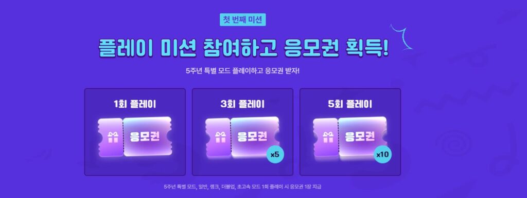 위에서 소개해드린 경품을 받기 위해서는 응모권을 필요로 합니다. 얻는 방법은 굉장히 쉽습니다! 플레이 횟수에 따라서 응모권의 갯수가 정해지는 방식인데요. 1회 플레이 시에는 1개, 3회 플레이 시에는 5개, 5회 플레이시에는 10개를 주고 있습니다. 중복이 가능하기에 굉장한 열기가 있는 이벤트인데요.
