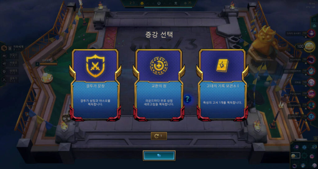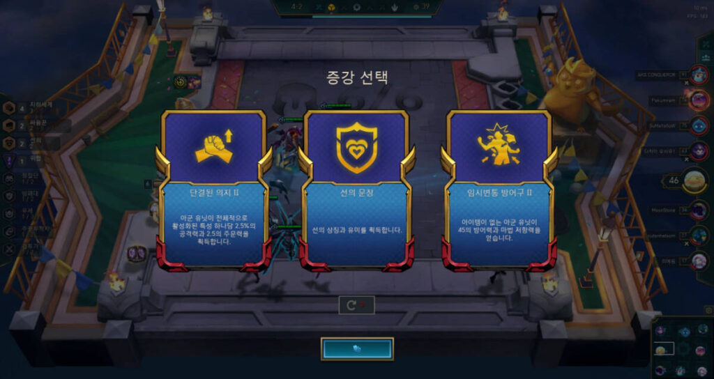 사실 두 번째 증강을 건너뛰었는데, 그 이유는 아무거나 골라도 되기 때문입니다. 이번 시즌은 세 번의 증강 중 한 번은 챔피언을 강화 시켜주는 증강이 나타나는데(그렇지 않은 경우도 있음), 현재 덱에 맞는 챔피언을 선택한다면 가장 좋지만 성능이 너무 저조한 경우 어쩔 수 없이 다른 것을 선택해야 하는 상황이 벌어지기 때문입니다.