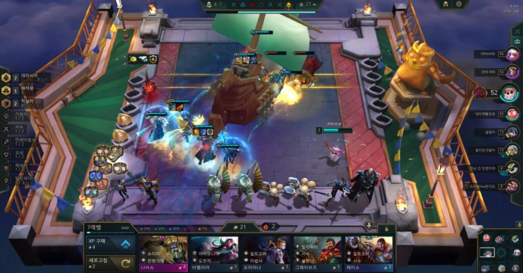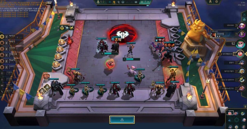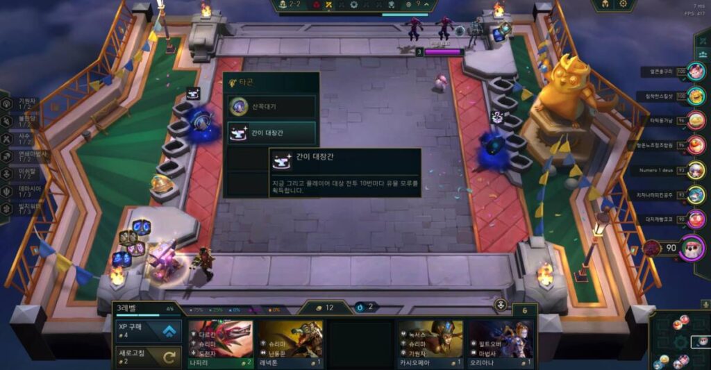 위 사진은 더블업 모드의 초반부입니다. 가만 보면, 무엇이 다른지 감을 잡기가 힘드실 것입니다. 아무래도 기본적인 플레이 기반 자체는 일반적인 TFT와 같기 때문일 것인데요. UI에서 오른쪽을 보시면 유저들이 2명씩 짝을 지어 같은 색 띠를 하고 있는 걸 볼 수 있습니다. 이를 통해서 적과 적의 팀원을 구분해낼 수 있습니다.