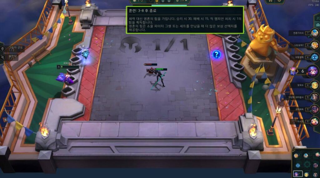 앞서 언급하였듯, 3-8 페이즈까지는 훈련이기 때문에 이렇게 높은 체력(영혼의 힘)을 보유하고 있을 수 있는 것입니다. 속전속결을 원하는 유저들에게는 다소 지루하거나 루즈한 모드로 느껴질 수도 있을 것 같은데요. 이제 막 롤토체스를 시작했다거나 여러 가지 덱을 실험적으로 해보고 싶다면 적극 추천하고 싶은 모드입니다. 또한, 한 판당 길이가 엄청나게 길다고 보기도 힘든데요. 그 이유는 아래에서 이어가겠습니다.