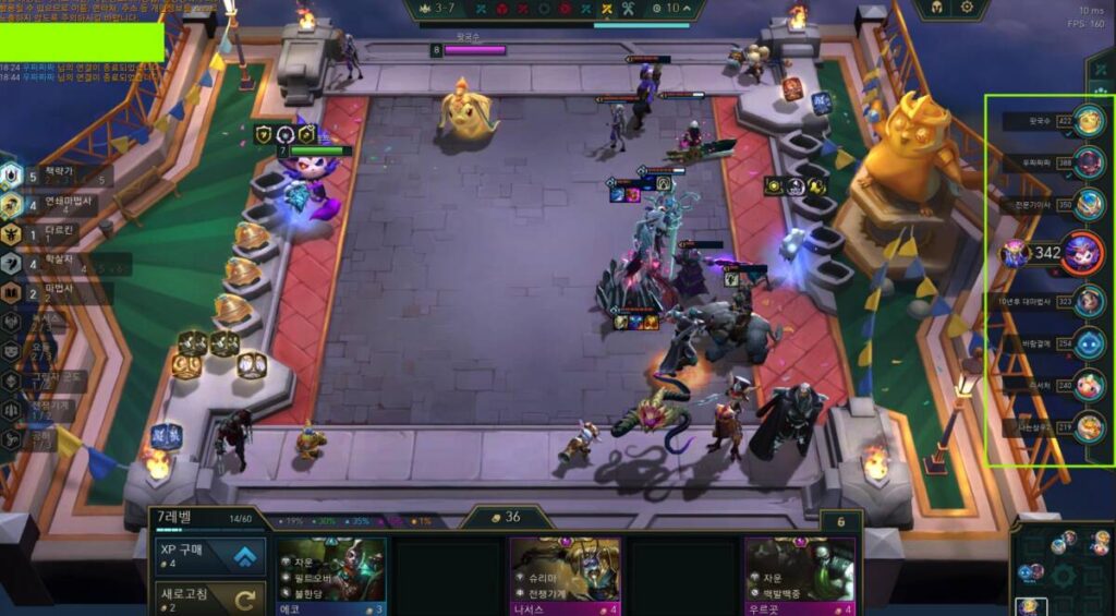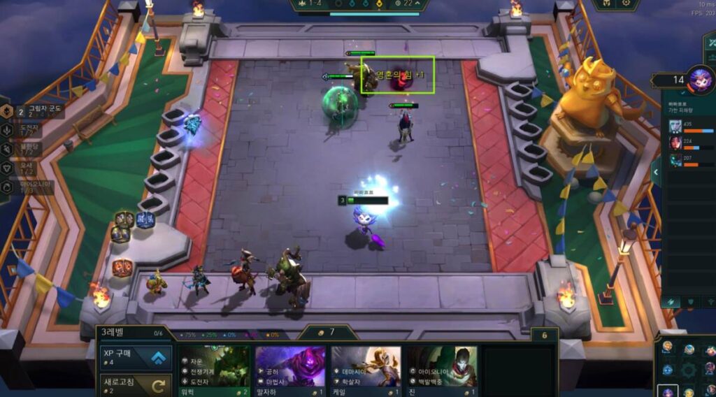 위 사진에서 오른쪽 체력창을 보시면 다들 기본 체력인 100 이상이라는 것을 보실 수 있습니다. 클래식한 롤토체스에서는 대개 체력이 100정도로 나타나는데에 비해 영혼의 결투에서는 100이상의 체력이 기본이라고 볼 수 있습니다. 이 때문에 처음 이 모드를 플레이 하는 유저들이 ‘끝이 안나는 게임’ 인 줄 알고 오해를 하는데요.