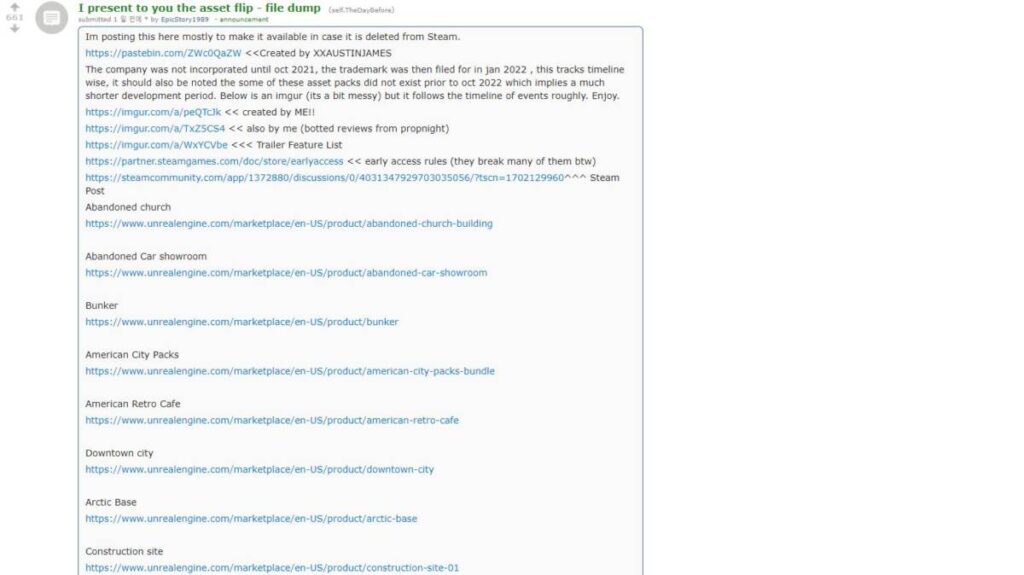 해당 글은 원래 레딧에서부터 쓰여졌던 것인데요. 짧게 요약을 하자면, 회사가 다루고 있는 대부분의 것이 가짜라는 이야기입니다. 심지어는 회사 출범 시기까지 조작된 것이라는 언급이 있습니다. 그런데 이것이 근거가 없는 추론에 가깝다면 이토록 사람들의 지지를 받지도 않겠죠. 글쓴이가 지적하는 것은 ‘Asset Flip’ 입니다. 우리말로 표현하자면 ‘에셋 짜집기’ 정도가 될 것 같은데요.