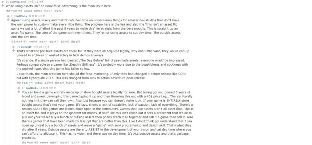 대다수는 이러한 정황에 가세하여 게임사를 욕하지만 레딧을 보면 휩쓸리지 않고 논란의 핵심만을 꼬집는 이들도 볼 수 있는데요. 말 그대로 엎친 데 덮친 격으로 안좋은 일이 비수처럼 계속 꽂히는 상황인 것 같습니다. 5년의 개발을 거쳤다고 하였으나, 실상 모두 구매한 에셋이라는 정황이 포착까지 되었으니.. 기만이라는 표현이 맞겠죠.
