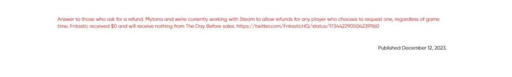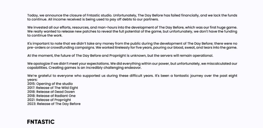 이렇게 거센 비판과 비난, 조롱이 이어지고 있는 가운데 더 데이 비포를 신작 게임으로 소개한 지 정말 일주일도 되지 않아서 제작사인 판타스틱(FNTASTIC)은 돌연 폐업을 안내합니다. 게임을 지속할만한 재정적 능력이 없으며, 모든 소득을 투자자들에게 상환하는 데 갚았다고 말하는데요.